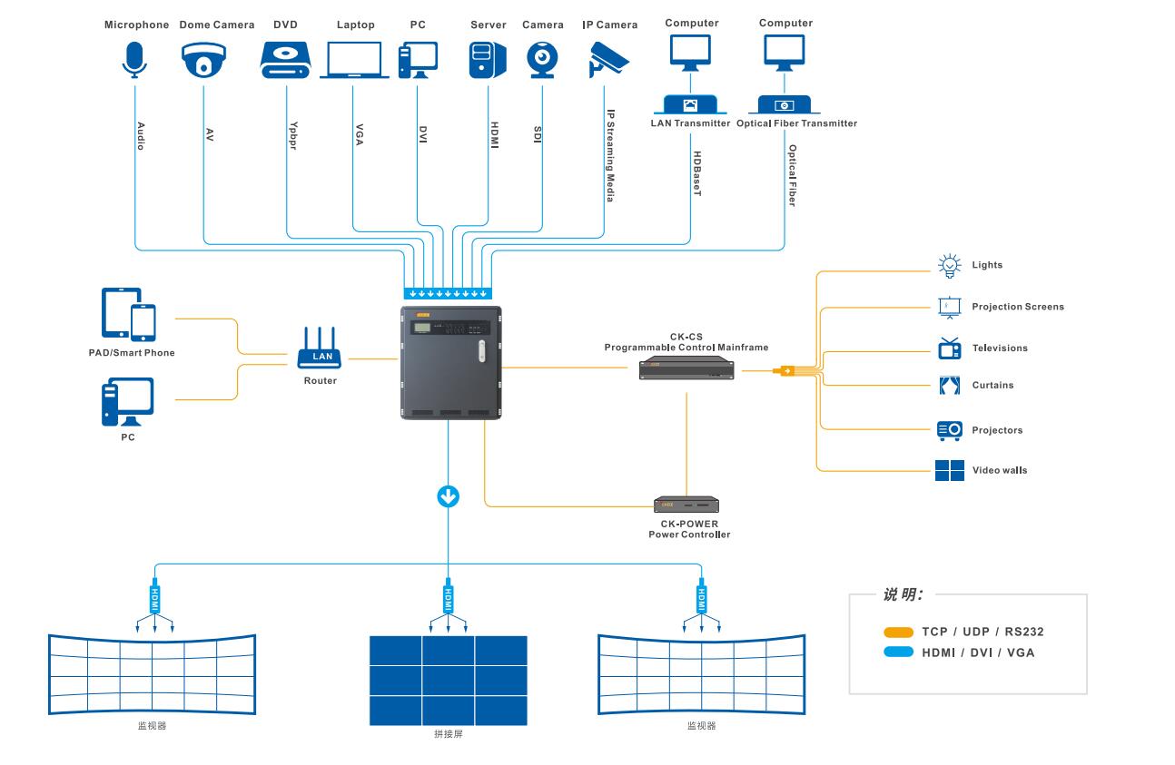 CKMC高清混合矩阵结合先进的硬件技术、独有的图像算法、倍频倍线处理等技术。支持行业内多种格式视频信号采集并统一整合,只需要一个控制软件即可实现整个系统的控制。采用插卡式模块化设计,是一款配置灵活、运行稳定的万能型信号切换设备。