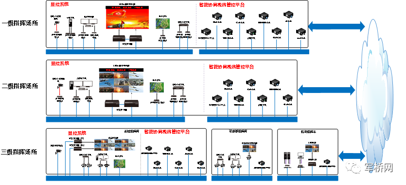 智能协同视讯管控平台可分多级部署,图中系统为三级部署,一级指挥所、二级指挥所、三级指挥所可根据业务内容可有选择性的配置不同智能协同视讯管控平台设备,实现灵活部署。