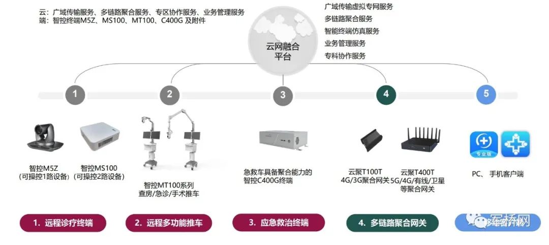 红云远程医疗专属配套终端主要分为五类,分别为远程诊疗终端、远程多功能推车、车载应急救护终端、多链路聚合网关终端、移动客户端APP。这五类终端产品需要相互组合可满足十二个常见应用场景需求。