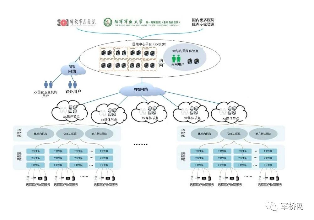 远程医疗云平台,是远程医疗服务的核心与关键,包括高可靠高清视讯系统、网络聚合传输服务系统、终端远程操控服务系统、医学媒体内容存储分发系统、云救治协同系统、云教学培训系统、云监管调度系统;该平台通过融合网络聚合传输系统很好的解决了单运营商网络覆盖不均匀、网络不稳定、高速运动状态保障效果差、传输延时高等问题;其它应用系统分别从高可靠高清视讯保障、流媒体储存分发、医疗设施远程操控、医治场景高清共享、优质医疗教学资源共享、平台运行调度日常管理等角度,根据不同终端用户的的具体需求提供功能定制化服务。