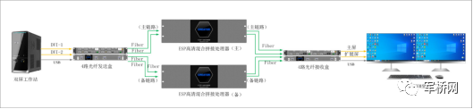 搭配双路四光备份模块可实现双路双光同时备份模式,支持大屏双光备份和坐席双屏双光备份多种模式组合。两台光纤矩阵并行联合运行,系统主链路发生故障时,系统可自动检测、即时重新配置系统,在短时间内切换到备用传输链路,备份系统自动切换时间不大于1s。同时也支持4路四光同时传输音视频和控制键盘鼠标信号。