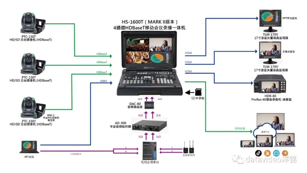 Datavideo HS-1600T MARKII,我们也可以称之为移动会议录播一体机。4通道便携手提箱式的设计,运用HDBaseT技术,可以更快更轻松地进行活动架设,简化正常操作流程的设备。