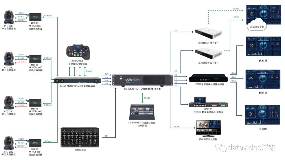 对于多路的编解码可选择用HBT-50, HBT-50是一台四路 HDBaseT 视音频解码器,是视频制作链里很重要的一环。其可通过 PoE 技术传送电源到云台摄像机、通过以太网线传送视频与音频,并且作为云台摄像机与摄像机控制器之间的 RS-232/422 接口使用户能远程设置摄像机参数如光圈、变焦、默认记忆等。HBT-50 同时传输 SDI信号(最高 1080p60)和HDMI信号(最高 1080p60)以及摄像机控制信号,达成完整的视频制作解决方案。这样的解决方式对现场节目制作非常棒,因为无需额外准备4个HDBaseT解码器,一台HBT-50就能搞定。