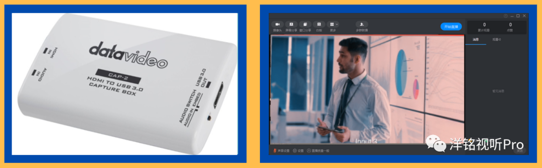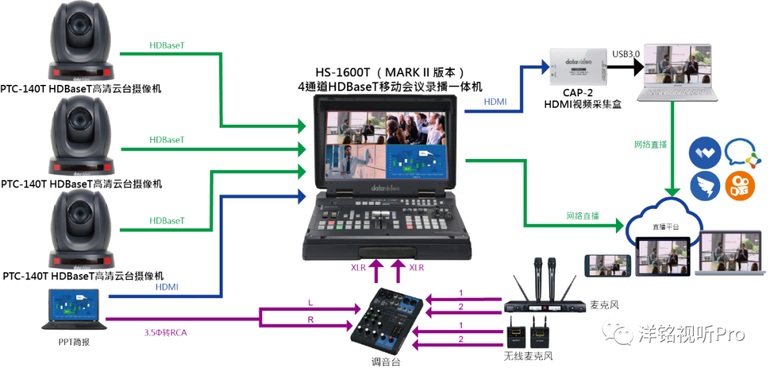 为将视频信号有效地兼容网络视频会议软件,如目前大家常用的腾讯会议、钉钉会议等,我们推荐通过Datavideo洋铭HDMI视频采集盒CAP-2将HS-1600T(MARK II版本)的现场会议信号转为USB3.0连接到电脑,就能够流畅稳定地与其它多点会议终端在软件平台进行实时地交流互动。