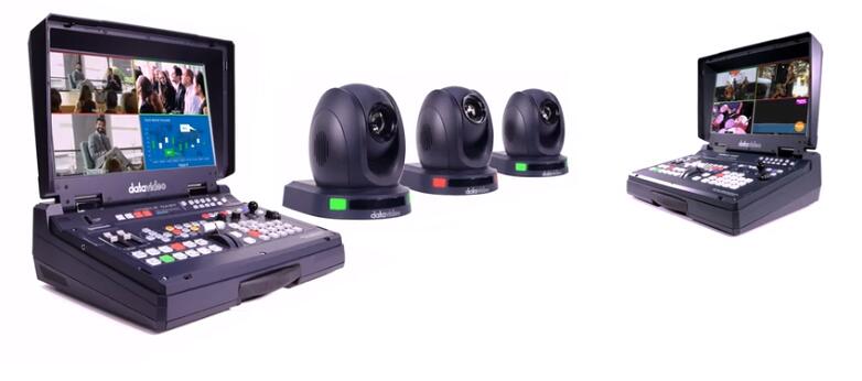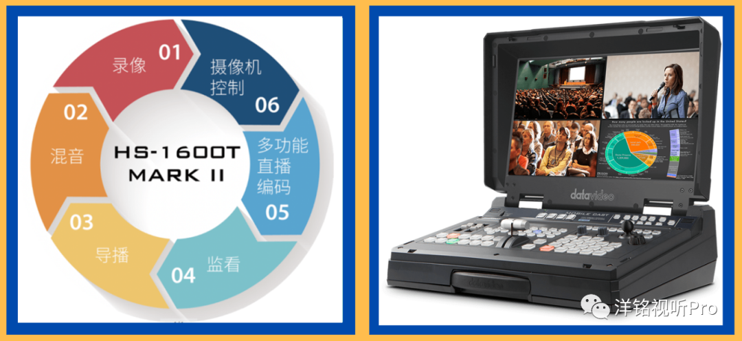 为Datavideo洋铭4通道HDBaseT移动会议录播一体机HS-1600T(MARK II版本)。这套移动便携设备专为视频会议直播录播设计:既能切换多台摄像机与会议电脑信号,还能够直接远程控制现场摄像机的拍摄构图,每个机位可预存4个预置位并快速调取使用,实时进行本地录像和推流直播。这款设备全硬件设计,接口丰富,具有大按键面板、单键单功能,4:4:4 10-bit内部信号处理,广播级音视频接口标准,可监看多源信号,含常用特技转场及音频监听、混音等等功能,是一款高度集成的广播级视频会议重要设备。