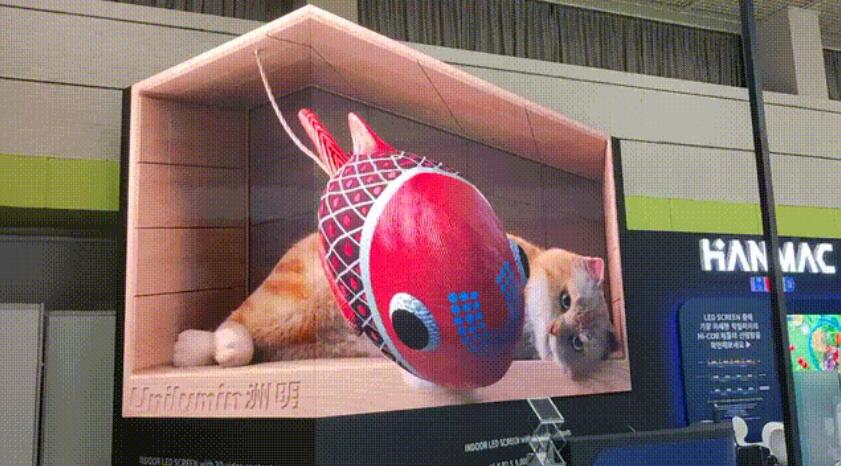 走进主展馆,华为、松下等大厂设备满目琳琅。相比冷冰冰的电子设备,一只裸眼3D「猫」明显俘获了大量观众的心。洲明内容团队创造性地将人们朝夕相处的萌宠搬上屏幕,彷彿突破空间的体验感吸引了一批批观众打卡拍照。