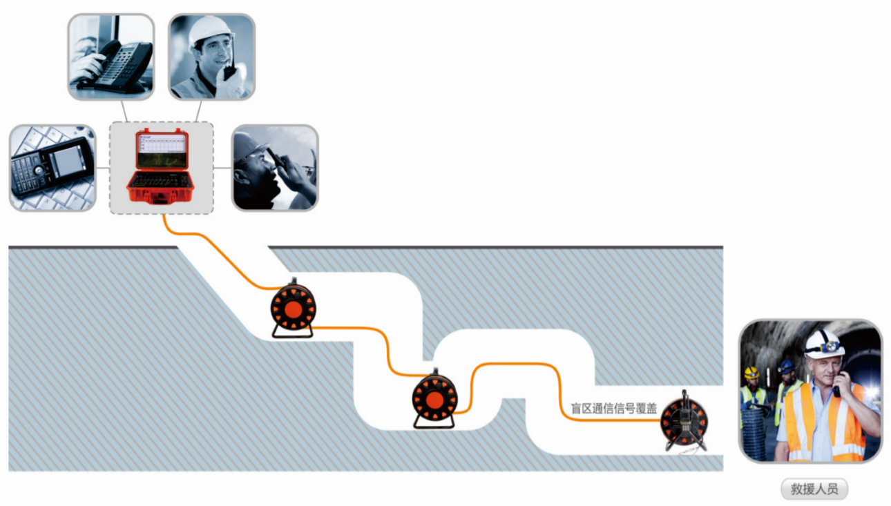 在地下室、隧道等超短波通信盲区内,设备可快速连接100米卷轴电缆(连接15卷,长度可达1500米)引入到通信盲区内,终端并接入一台对讲机,就能够使处于地下室或隧道内的救援人员与外界人员保持通信畅通。