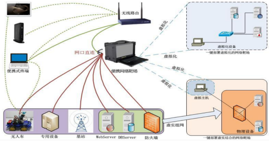 依托底层的技术优势,能够在虚拟网络中接入真实设备,实现共同组网,实现虚实节点替换,搭建更为复杂的网络环境,组成大规模的攻防研究场景。