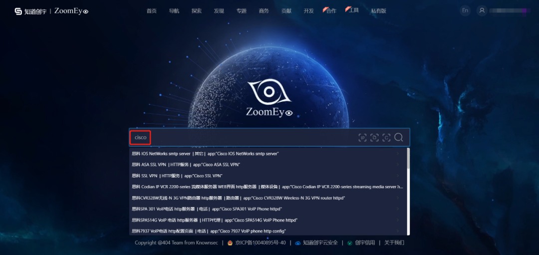 ZoomEye SAAS服务是针对特种行业用户需求定制开发的在线检索和查询产品,用户可以直接通过互联网,获得网络空间测绘数据资源的在线利用能力。