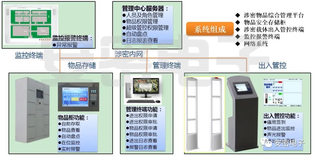 系统由文件、档案及信息载体智能安全管理系统软件、物品安全存储柜、出入安全管控终端、物品标签(条码)组成。主要为U盘、移动硬盘、笔记本电脑、文件、档案等信息载体提供安全监控管理。通过管理软件和射频阅读设备组成射频电子识别系统,对文件、档案及信息载体在位及使用情况进行实时查询和追溯管理,利用读写器组成监管系统实现对进入涉密区域的人员和文件、档案及信息载体安全防泄密管理。