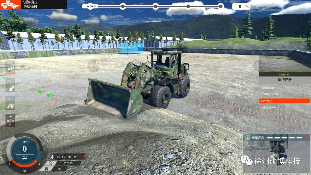1) 训练模式:各类地形驾驶(城市道路、综合场地驾驶、复杂野外道路、山区、战区、连续障碍等)、上下平板车、牵引驾驶;各类作业课目,推土(砖块)、运土、装土、卸土训练、刮平作业、平整场地、各类型装车作业、回填沟渠、夹抓等课目训练。