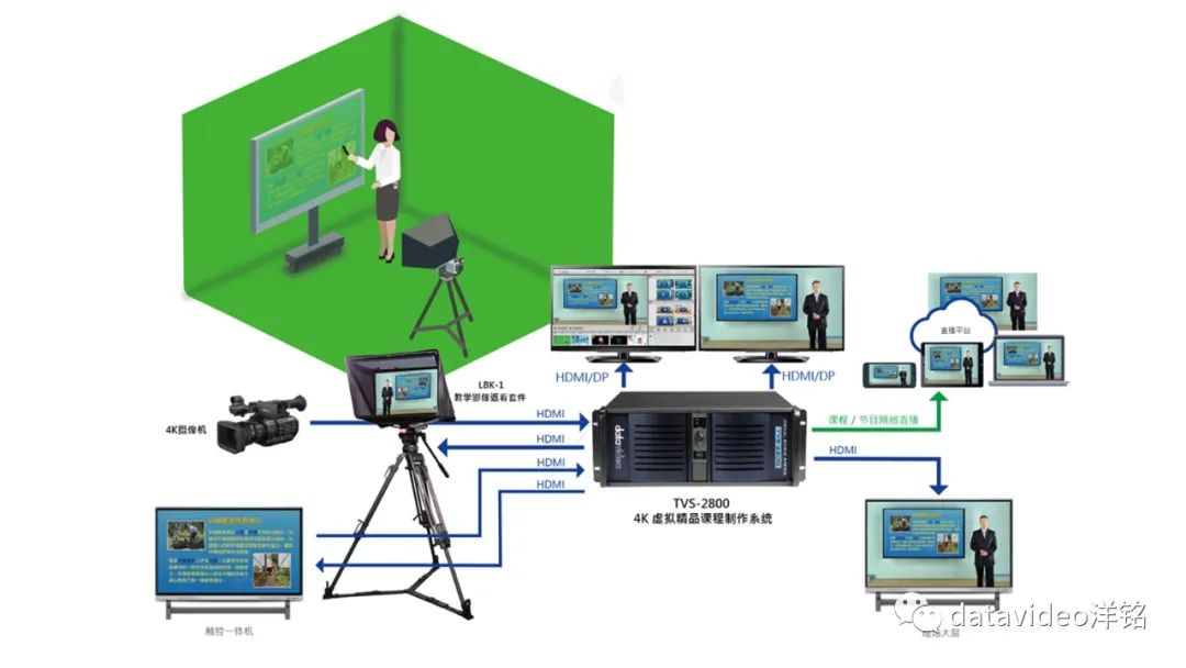 以洋铭TVS-2800为核心的4K虚拟精品课程制作系统,包含“摄、录、编、播”等组成的完整的校园电视台精品课程录制核心系统。