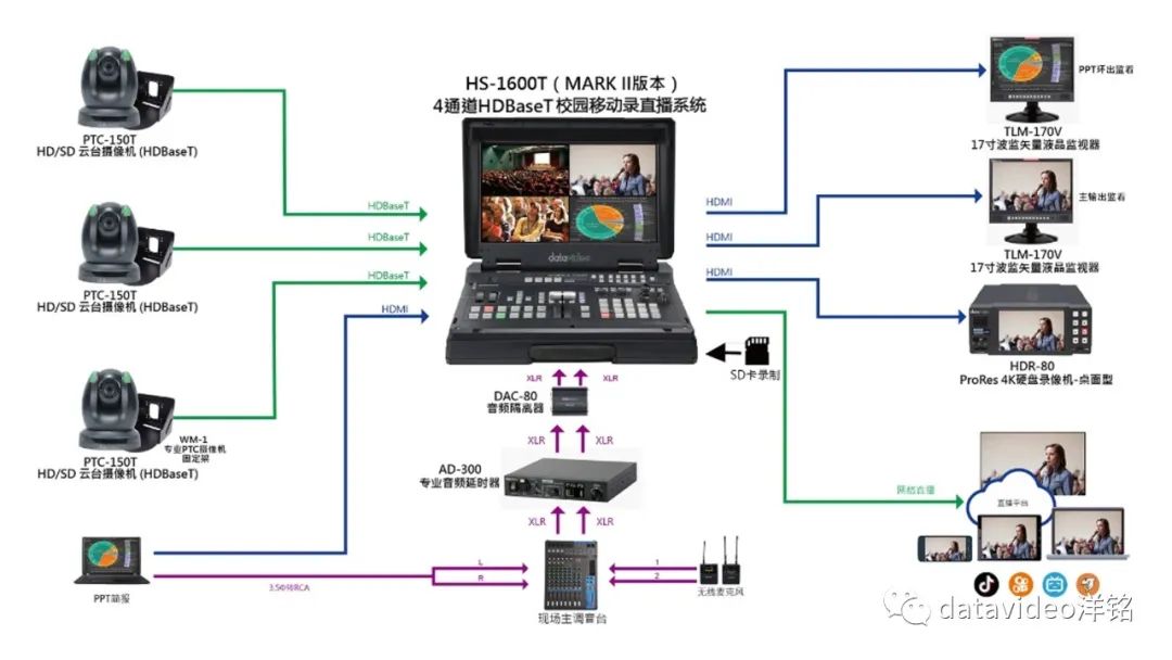 4通道HDBaseT校园移动录直播系统,以洋铭HS-1600T MARKII版本和洋铭HDBaseT技术云台摄像机PTC-150T为核心设备。