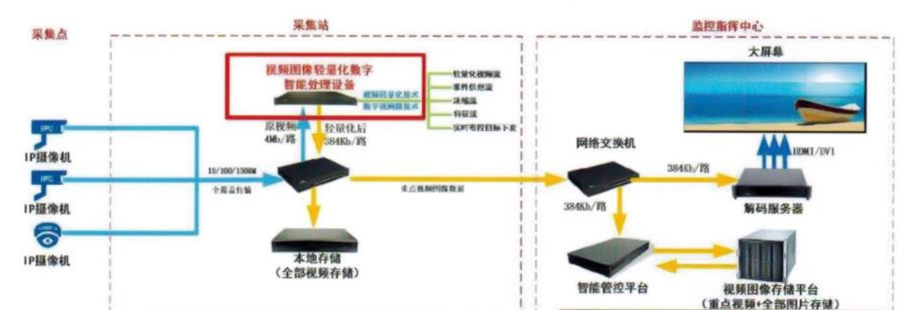 视频轻量化设备基于国产自主的深度学习轻量化算法,把高清视频重新轻量化编码,使得高清视频可以在极低带宽下传输,从而解决了窄网络条件下实时传输大量高清视频的问题,便于低容量刻录光盘永久备份以及革命性提升海量视频结构化数据分析需要的大量数据传输、处理、存储的能力。