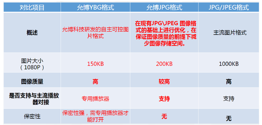 针对以上急需解决的问题,允博科技应用先进的视频图像轻量化及云脑+数字视网膜技术,在符合国家图像视频标准的前提下,将所需传输带宽及存储空间节省为目前标准的1/8,仅存储经费就可以节约达50%以上,其他节约的包括传输部分、能耗等方面综合成本是个量级变化,能够为国家节省巨大投入。