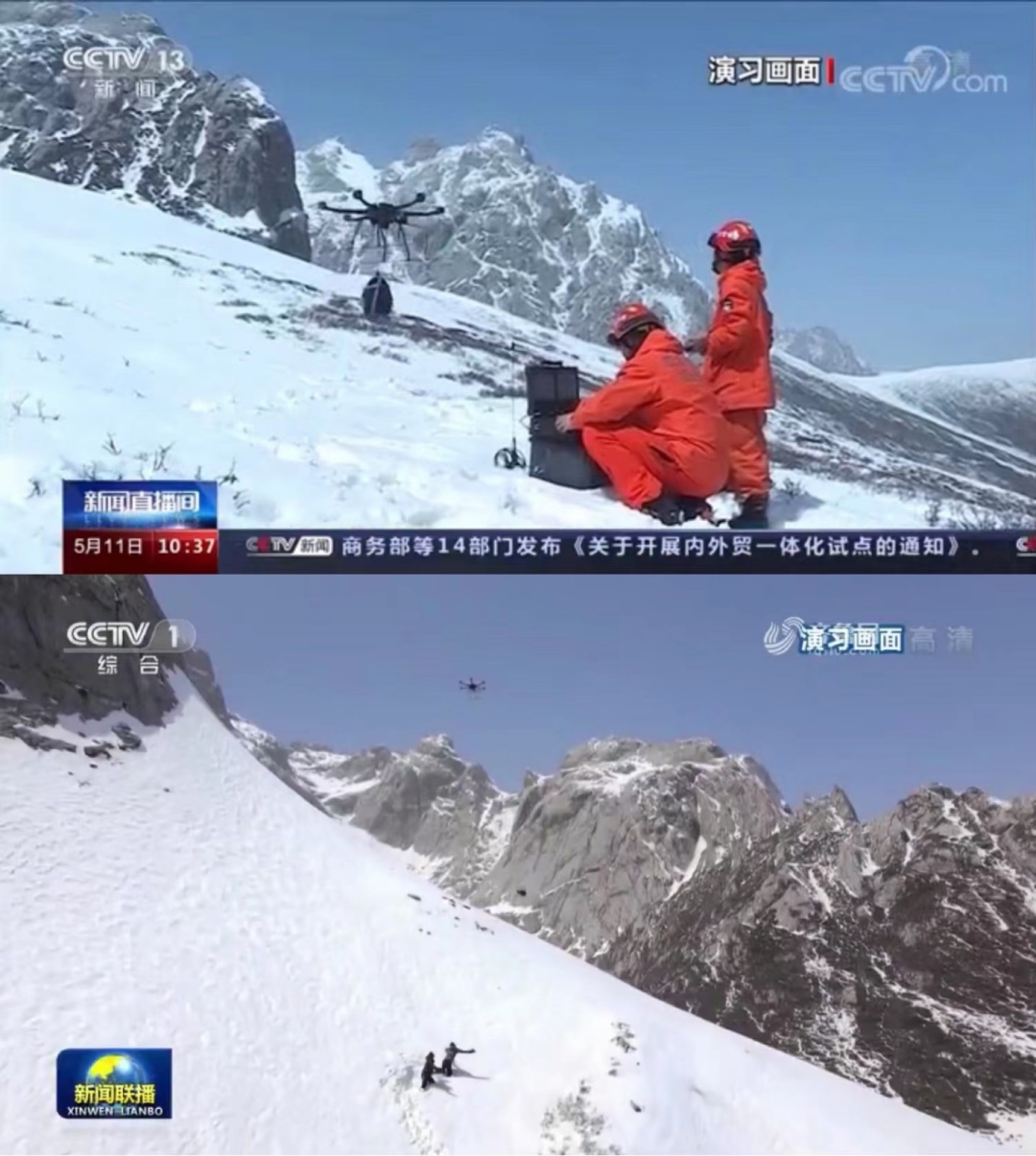 除用于快速定位被困人员的红外双光吊舱,X120战狼无人机还配备了一款多功能抛投吊舱。通过程序设定,抛投吊舱可在任意不同位置多次定点投送物资,也可任意点地面操控投送物资,且可实时观察空中航拍图像,对目标位置实施十字光标定位以达到投送精准的目的。随后营救人员通过多功能吊舱(多点抛投+喊话)进行实时喊话,安抚被困人员情绪,同时携带应急保温毯、补给品降低飞行高度,悬停在被困人员上方执行抛投作业。应急保障物资被准确地抛在被困人员附近后,人员立刻进行自我保护(保温、保持体力等),为救援人员的到来赢得了许多宝贵时间。最终通过与各部门的协同救援,架设转运安全路线,开辟救援通道,将伤员安全送上直升机,成功救出遇险人员,圆满完成此次雪山遇险人员搜救应急救援演练。
