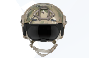 头戴显示器将处理器、存储器、光学透镜组件等融合在一起,构成头戴式一体机。加装电控遮罩及控制电路,实现VR/AR功能,加装外置扩展电池,满足工作时间要求。头戴显示器与仿制军用头盔采用软连接方式,便于佩戴和调节。