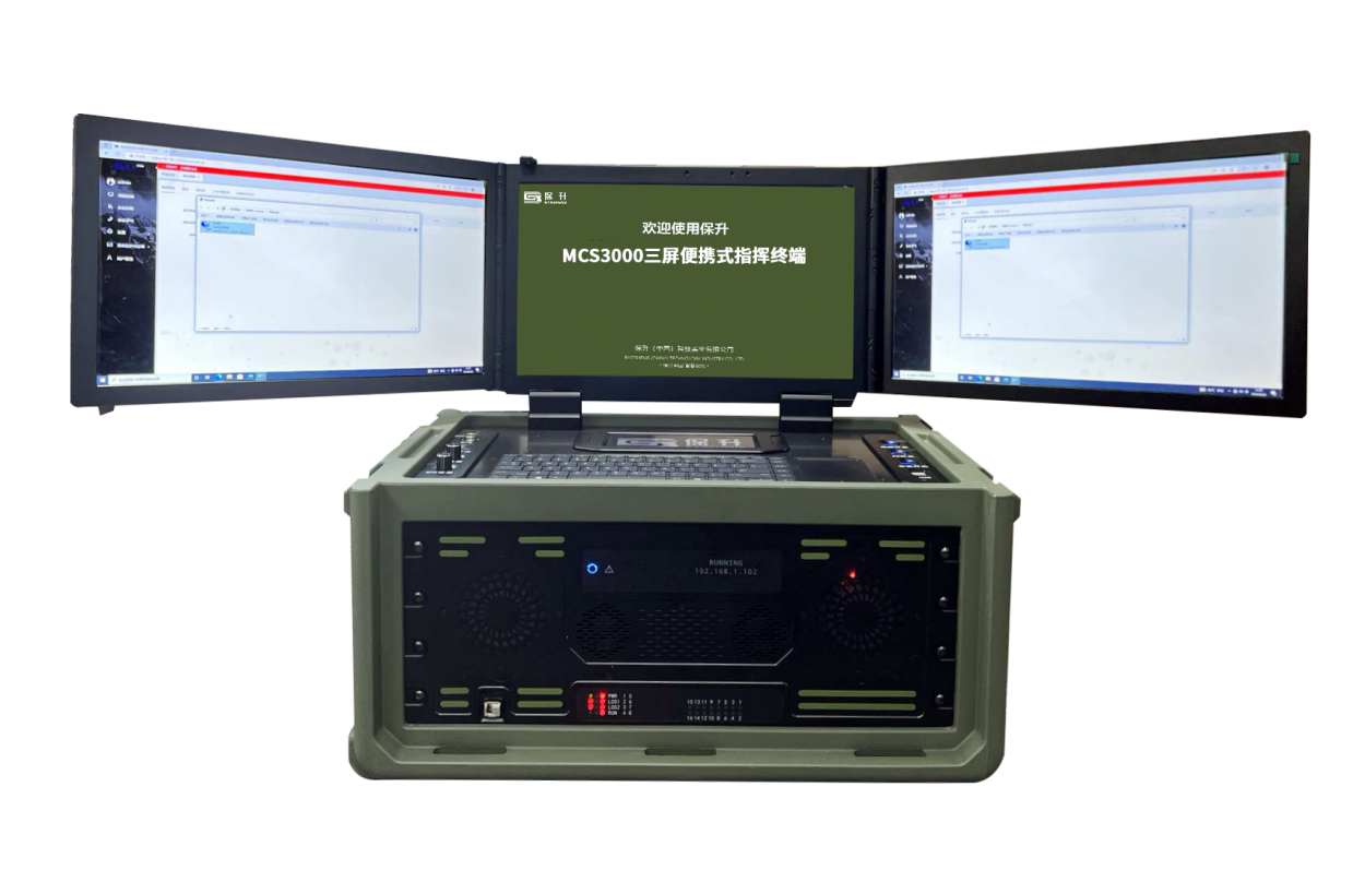 保升 MCS3000 是一款移动便携指挥箱。本产品是用于特殊工作环境中设计开发的一款拉杆式指挥箱,将诸多功能模块与接口集成之中(设备内部集成 PC、视频会议终端、摄像头、光端机、8*8 视频矩阵、8*8 音频矩阵、显示屏、扬声器、话筒等基础设备)。