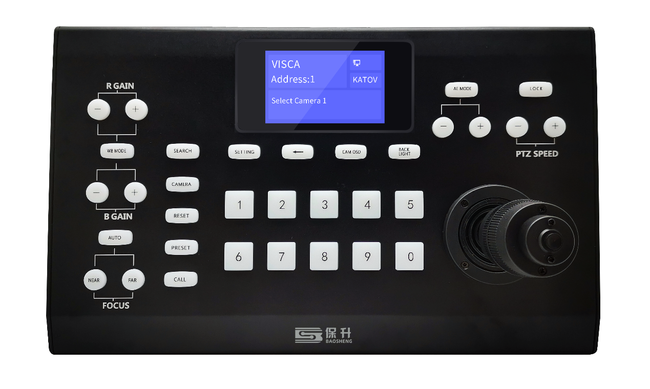 保升 CK2100 会议控制键盘有很强的操控性,集成 3 寸 LCD 屏,直观展示当前状态。集成 3 维摇杆,可控制摄像机Pan、Tilt、Zoom。通过面板按键可快速控制摄像机聚焦、曝光、白平衡、背光补偿等功能。