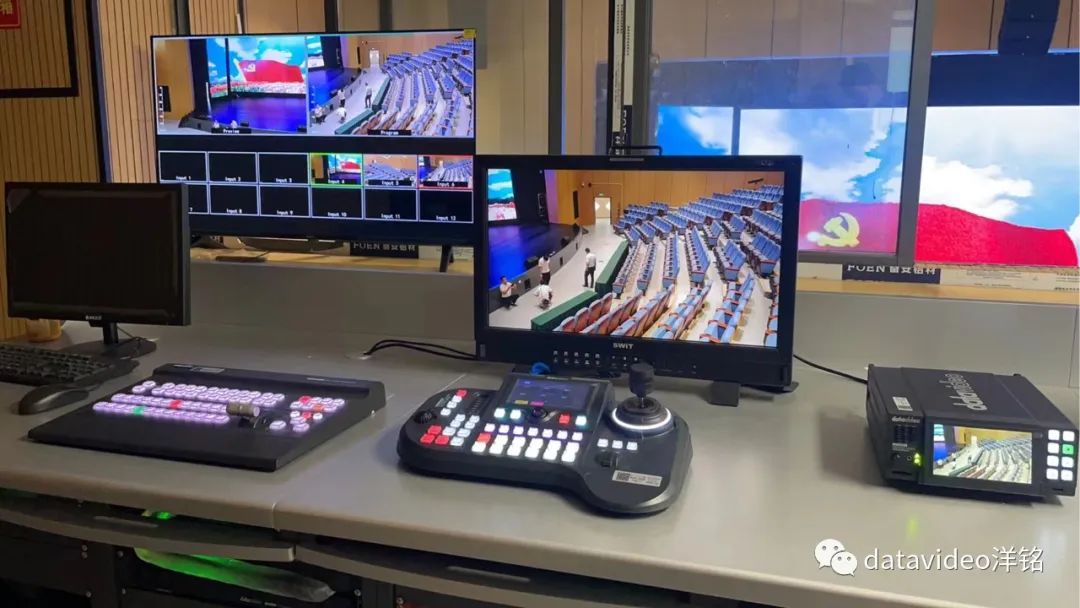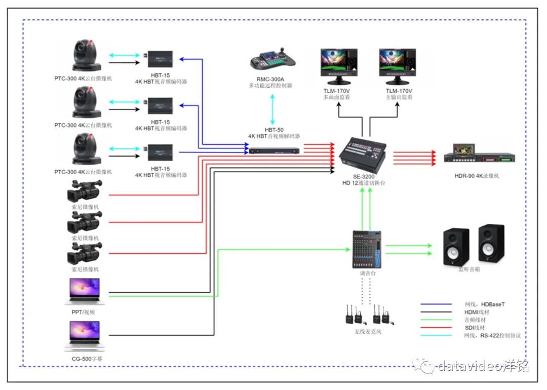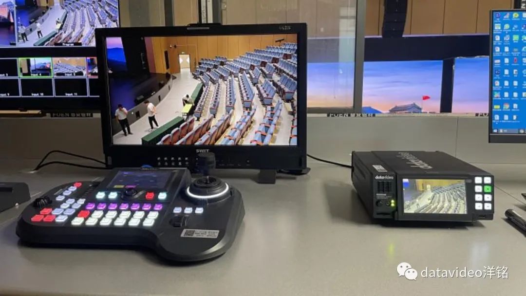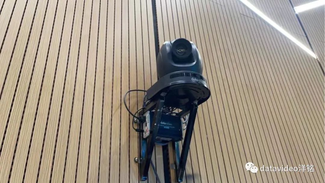 根据现场的摄像机位置图片可以看到PTC-300摄像机下面有一个小盒子,那是洋铭HBT-15 4K HDBaseT 视音频编码器,可用于长距离传输,传输布线只要一根CAT6网线,就能传输视频,控制及TALLY信号,在导播台这边装一个洋铭四路HDBaseT视音频解码器HBT-50,几台云台摄像机的信号就可以解码出来,布线十分快捷方便。云台摄像机远程控制采用洋铭RMC-300A全功能控制器,对每个机位的配设角度可预置位置,且一键调用。