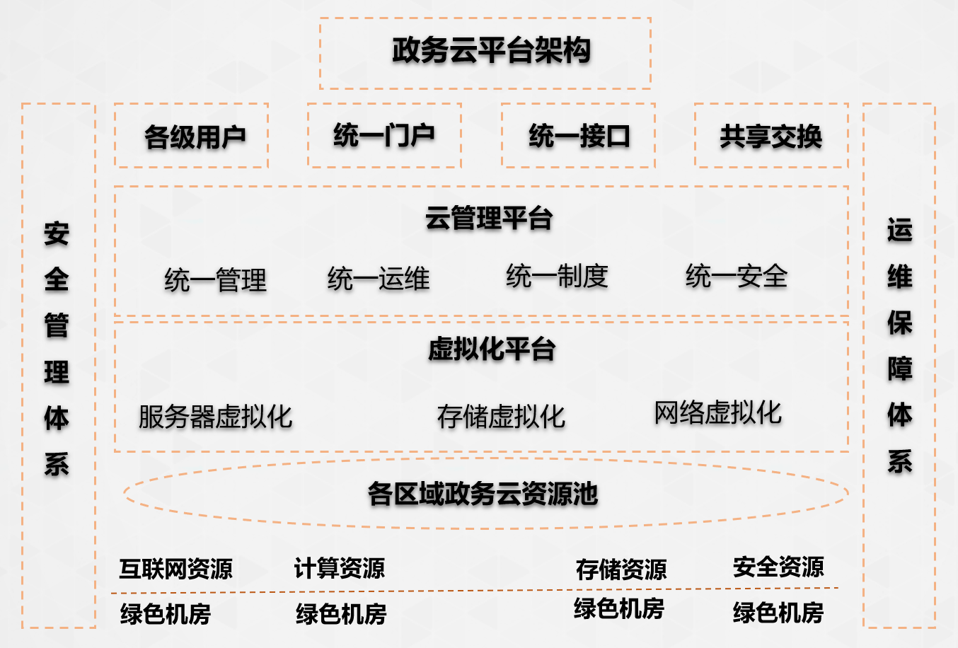 电子政务云平台建设按照电子政务建设实际需要,构建了“五横两纵”的体系框架。