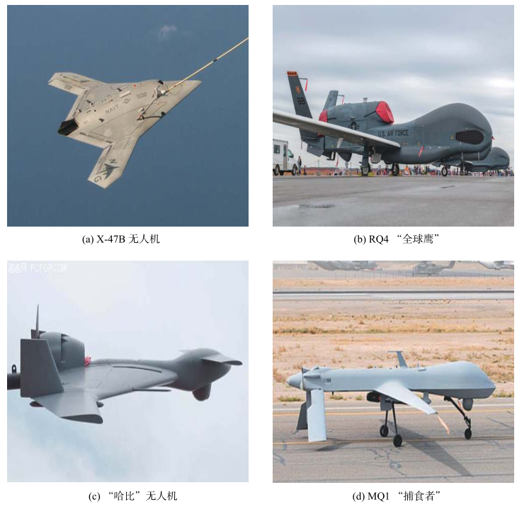 2003年,美国将空军和海军的无人作战飞机系统项目合并,启动了“联合无人作战系统”(J-UCAS)项目,开始了对无人作战飞机X-47B的研究。2006年,美海军提出了“海军无人作战航空系统”(N-UCAS)项目,旨在为航母舰载机联队引入无人作战飞机,并继续对X-47B开展研究。在2012—2014年间,又多次完成了航母弹射、着舰、触舰复飞等试验,并于2015年完成了自主空中加油试验。X-47B攻击型无人机是一款可以自主操纵、隐身性能好且适用于陆基和舰载的无人作战飞机,具备高航程和高航时的特点,装备有照射雷达、光电制导系统和孔径雷达等先进的传感器,主要功能包括情报侦察、目标追踪、电子战干扰、火力打击等。美国研制的其他空中无人系统,如“全球鹰”、“捕食者”、“猎人”和“大乌鸦”等也已在军队服役,如图3所示。