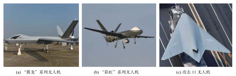 在空中无人系统方面,成都飞机工业集团研制的“翼龙”系列无人机具有全自主水平起降能力、巡航飞行能力、空地协同能力与地面接力控制能力等,搭载有多型光电/电子侦察设备以及小型空地精确打击武器,可以执行情报侦察、目标跟踪、火力打击等任务。我国研制的“彩虹”系列无人机具有中空长航时的航行能力,可以搭载电子干扰系统与多种武器系统,能执行火力打击、情报侦察、通信干扰、电波干扰等任务;研制的攻击11型无人机具有极强的隐身能力,可以搭载精确的制导导弹,用于执行对地攻击任务。我国空中无人系统如图5所示。
