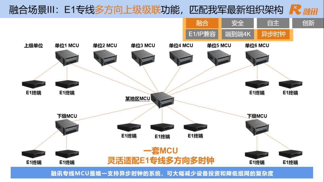 融讯科创独有的E1 MCU多宿主技术,一套MCU可以同时与多个采用不同时钟的上级单位MCU进行E1级联,同时进行多组会议,无需在本单位部署多套MCU,匹配我军实际架构,大幅节省成本。