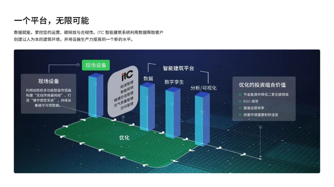 ;当前楼宇管理系统在系统配置、监测准确率、设备或系统集成稳定性、智能化控制、运维水平等方面都存在不同程度的问题。为改变这一现状,itc开发出一系列的创新技术来构建可靠的智能建筑基础设施,通过现场设备、应用模块及具有强大分析和可视化的智能建筑平台,为建筑运营核心领域带来全新效率,对楼宇进行持续优化,实现最佳的运营性能。