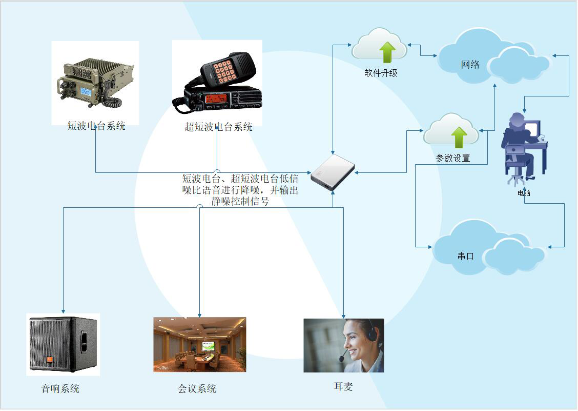 •短波电台、超短波电台等低信噪比通信系统接入到音响系统、会议系统、耳麦等要求声音信噪比非常高的音频系统中;