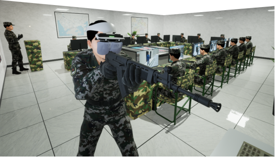 在MR环境中对执勤任务中遇到的多种事件进行模拟训练,并在场景中指定或随机初始化武装人员及非武装人员的位置,受训人员戴上MR头显,使用仿真枪械模拟器,对虚拟的武装人员及非武装人员进行处置训练。