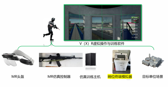 单兵MR模拟仿真训练系统由混合现实头盔、vr仿真控制器、执勤哨位台模拟终端、仿真主机及仿真操作训练系统软件等组成。