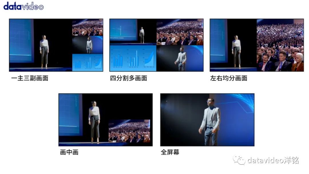 ,供您根据现场拍摄主题选择:一主三副、四分割、左右均分、画中画、全屏幕,让观看直播或者会议参与者更能沉浸式代入现场氛围。