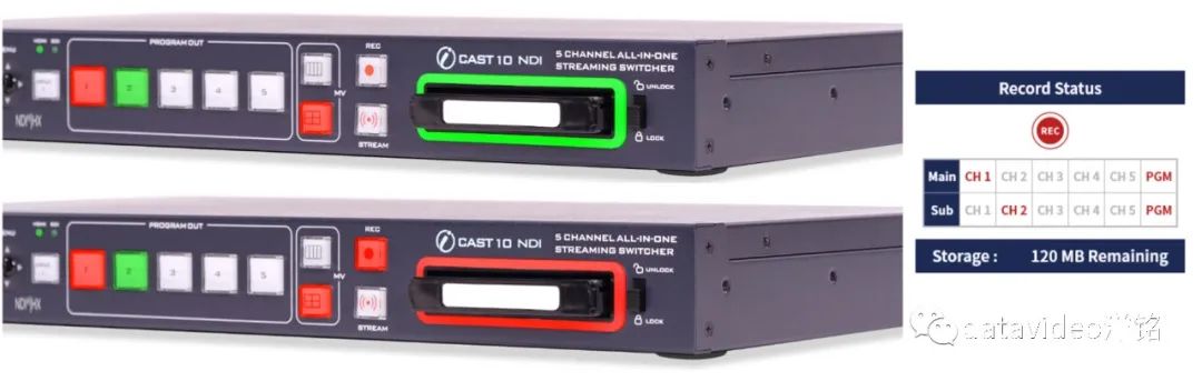 iCAST 10NDI独特设计的多通道同步录像功能支持您将5组输入、以及PGM输出这6组信号同步进行录制。保障正常直播画面的录制,也能保留下多个视频源的独立录像,为便于后期二次剪辑为录播所用。