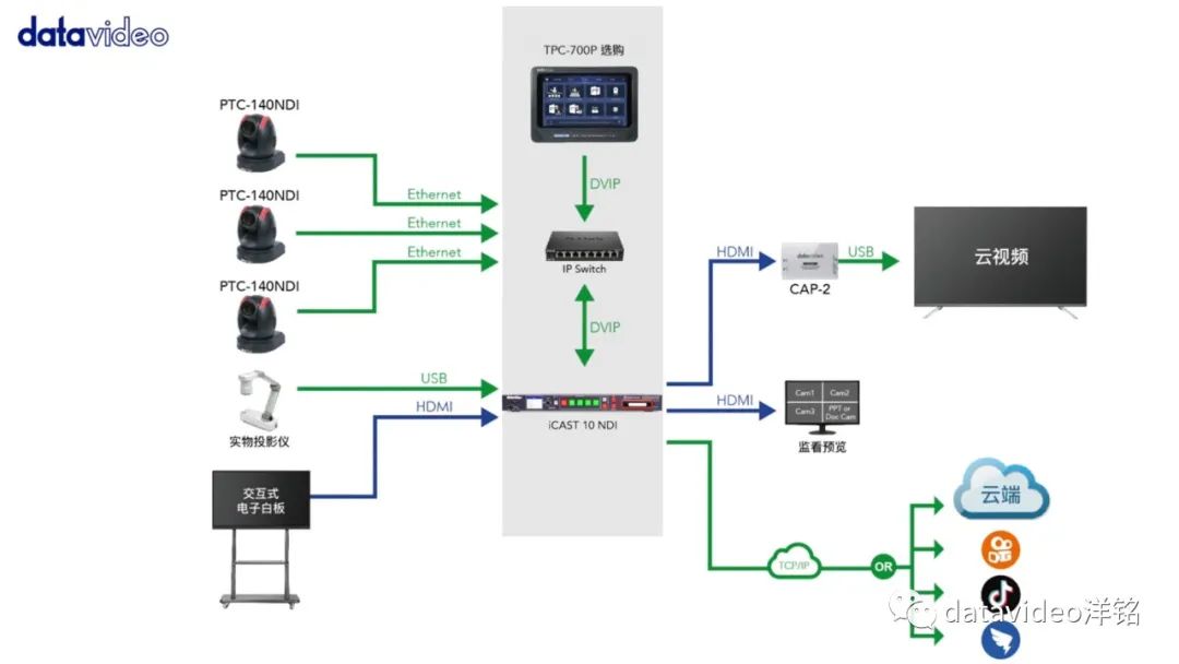 使用iCAST 10NDI可搭配Datavideo洋铭NDI系列云台摄像机,