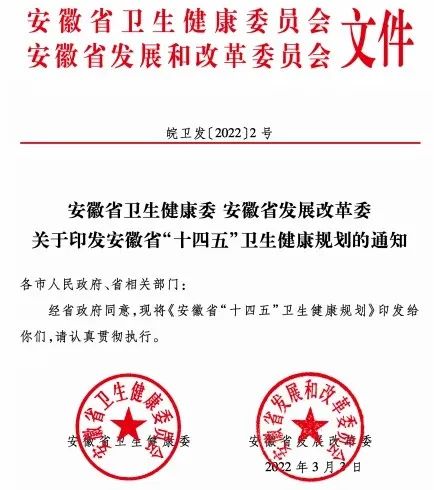 2022年初,安徽省卫生健康委、安徽省发展改革委联合印发《安徽省“十四五”卫生健康规划》,