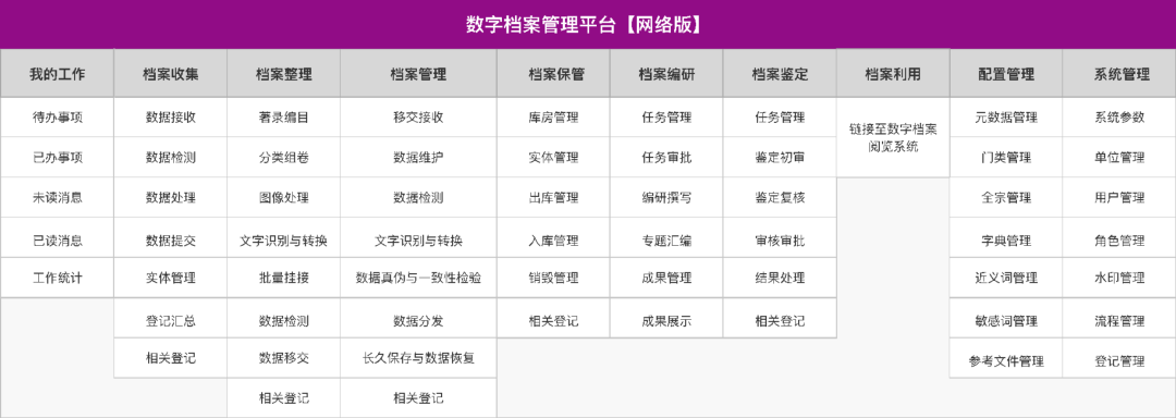 档案平台根据档案各环节业务场景对档案进行全流程管理,分为以下四大系统平台:
