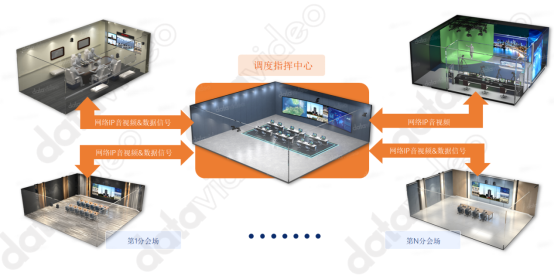 调度指挥中心目的在于能够实现全局可视、反应迅速、决策精准、指挥统一的效果,因此,指挥中心大厅的会场信号、各地分会场信号及演播室信号都通过IP方式汇聚于调度中心矩阵。