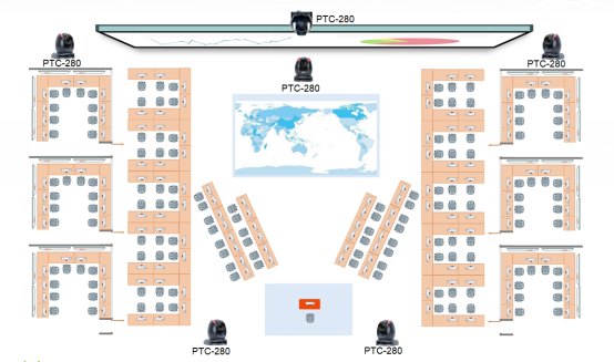指挥中心大厅设计为多机位会场拍摄,使用多台PTC-280 4K 50/60P云台摄像机分别布局于:主席特写机位、主席台正机位、全景机位、对角侧机位、左右操作席机位等,结合其71°的拍摄视角几乎能覆盖整个指挥大厅。