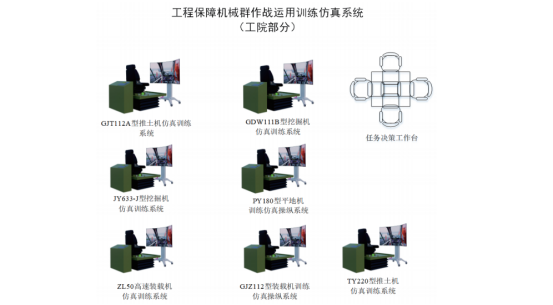 工程保障机械群作战运用训练仿真系统可独自创建和实施的多装协作训练,具体实现科目包括平整场地、回填沟渠、填塞弹坑、挖掘装车、挖掘沟渠、挖掘中型平底坑、装载作业等多个科目。接入其他配套分队战术训练模拟系统而组成的多装协作训练,具体科目包括了构筑急造军路、构筑野战指挥所、抢修原有道路、构筑野战直升机起降场等多个科目。