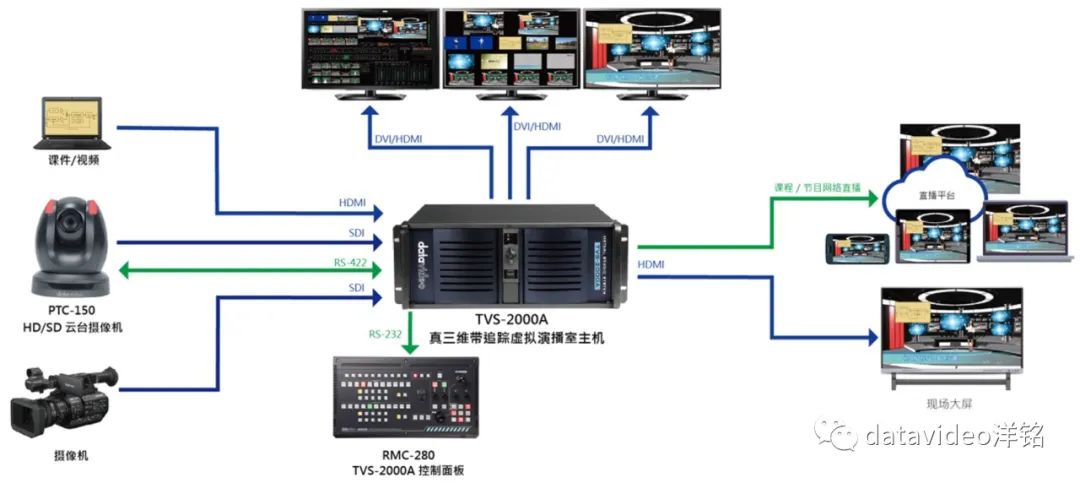 TVS-2000A真三维带追踪虚拟演播室系统五合一功能设计,包括追踪/无轨虚拟演播室系统,视频切换、字幕生成、录像和推流直播,有专属的虚拟背景网站专区,打造专属自己场景的,专业的录课设备。