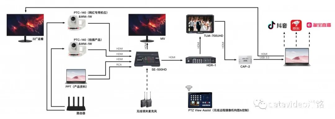 本系统中PTC-140云台摄像机最大的优势就是它的轻量化小巧设计,可以很轻松的调整横竖拍摄构图速度,SE-500HD也可使用快捷键快速调整横竖屏模式,PTC-140云台摄像机与SE-500HD切换台的结合可以轻松应对大量直播带货工作