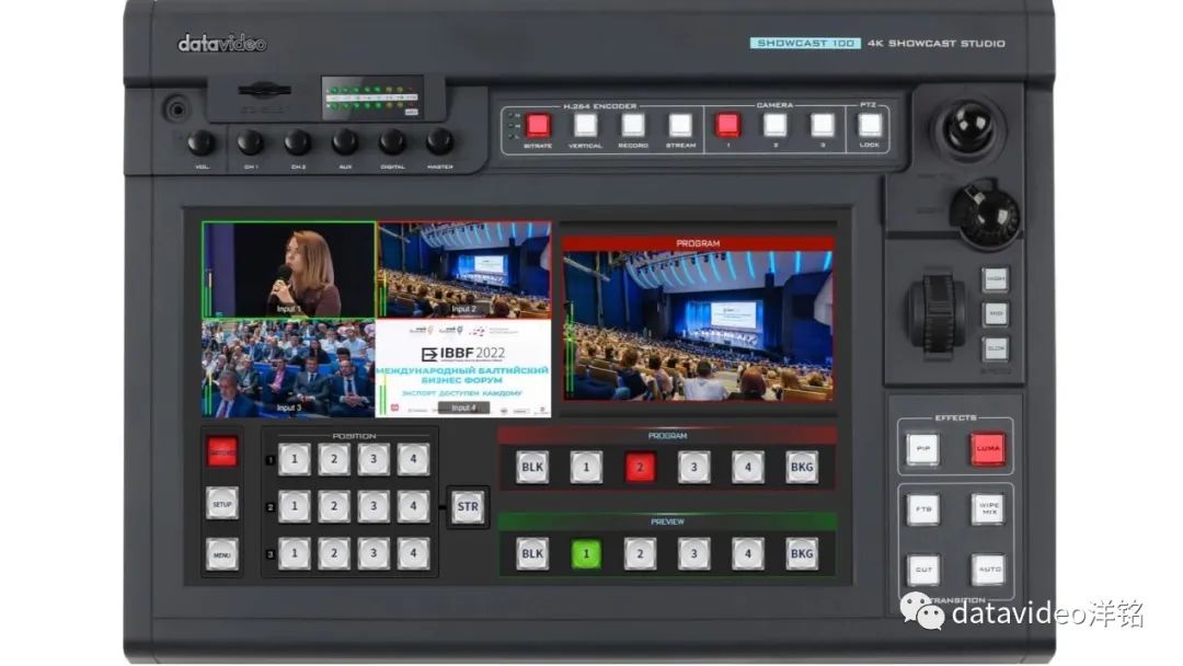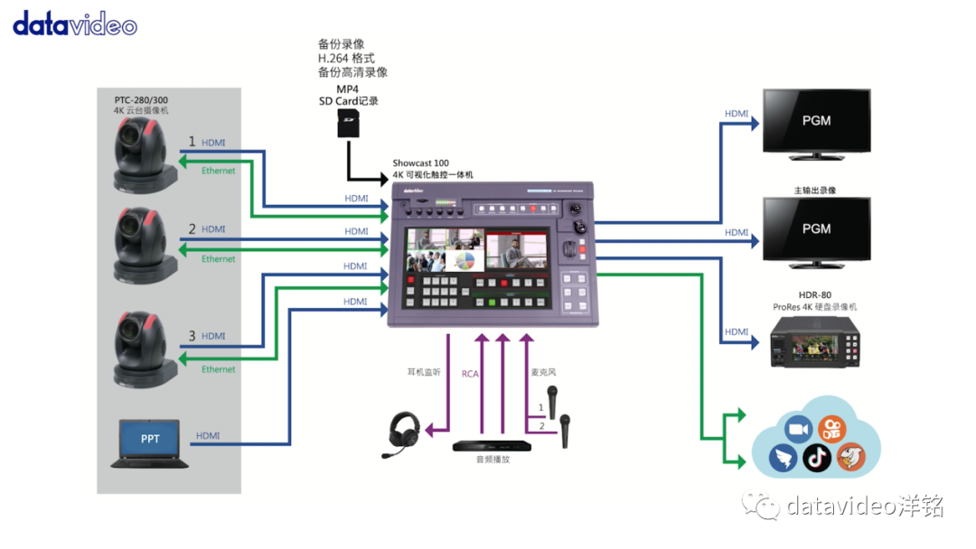 SHOWCAST 100搭配PTC-280/PTC-300 4K 50/60P云台摄像机,可通过 RS-422 接口、Datavideo专属的 DVIP 控制协议实现 IP 远距控制。