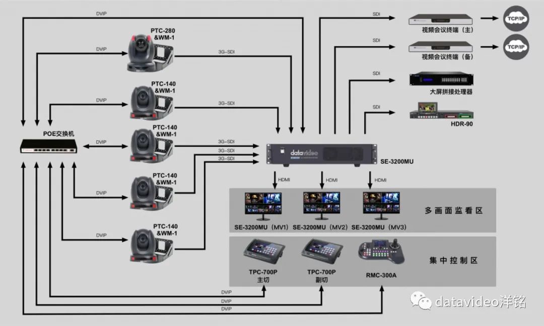 洋铭的大型视频会议系统解决方案特色在于采用多协议网传网控方式:POE供电使现场工程布线变得极为简单稳定,保障音视频信号安全无损的传输;结合DVIP网络协议,将会议系统的多个摄像前端及信号导切通过网络便能轻松实现远程控制;同时基于DVIP的多面板控制设计能满足分布式控制系统的规划,最大化降低系统操作难度、减少操作人力。该系统非常适用于企业政府单位,即使非专业人员也能快速上手,通过创意的可视化触控操作面板,能够同时远程控制摄像与导播,整个会议直播录播一键启动,快捷高效。