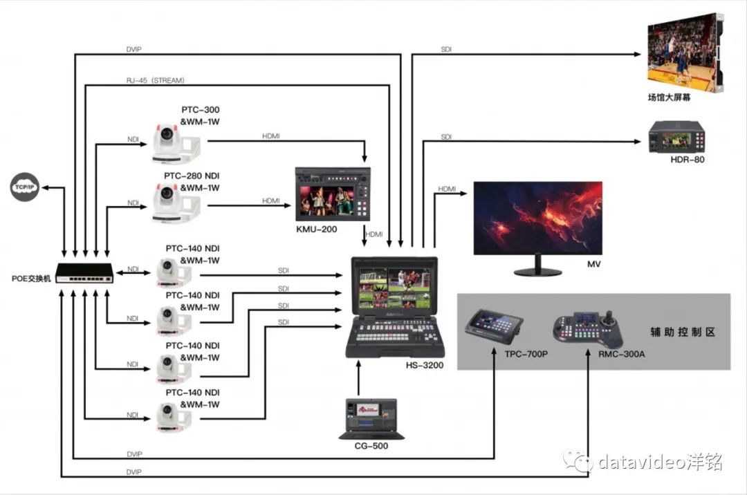 本方案中配置了主席台专用20倍长焦云台摄像机PTC-300,可以保证比赛运动员特写画面的拍摄,同时配有71°超广角云台极为PTC-280的顶装机位加持,再结合安装有超高马达的PTC-140NDI机型,在保证进攻方向拍摄不越轴的前提下,全方位快速准确抓取防线路。