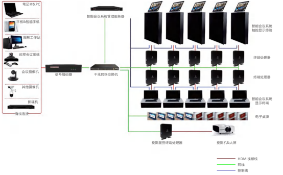 该系统包含智能会议管理服务平台,智能会议系统显示终端,终端处理器,会场服务端处理器和投影服务终端处理器几大部分组成,完成会议预约,文件管理,发布分发和会务配套服务等功能。