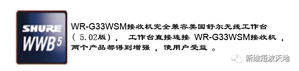 WR-G33WSM是世界首创专为演艺工程、舞台和体育场馆等大型公共场所设计的产品 ,供录音师、使用无线麦克风及其它无线音频设备的演员、以及无线遥测工程专用而开发的,其性价比极佳。