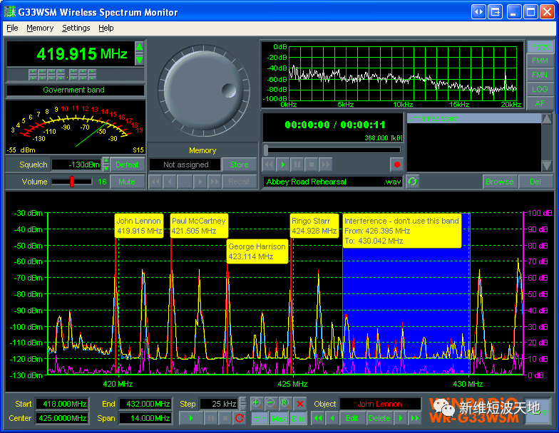 所有表演者和工作人员的话筒信号峰值都能在扫描频谱内清晰显示,还可以加标注及存储这些信息 。