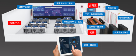 在指挥大厅配备1套可视化坐席调度管理平台,将厅内声光电视讯等设备进行链接,搭配科大讯飞语音识别引擎实现语音控制空调温度、音响音量、窗帘开闭、灯光开关、摄像头动作、中控场景切换等功能,让指挥中心更加快速进入备战/作战状态。对接外部监控、门禁、移动单兵等系统平台,实现内外部互联互通,进行集中调度、联合指挥、统一管控,从而帮助用户应对各种场景需求,快速进行智能化场景应用调度,通过可视化交互界面,让使用者一键式即可完成场景布局和切换。