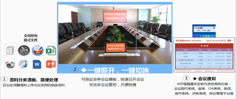 根据会前、会中、会后清晰管理,超薄高清显示屏与升降器一体化设计,触摸式人机交互方式,优化、改造传统会议流程,提高会议效率。